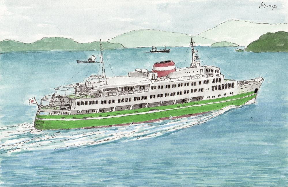 わたしが撮った写真をもとに1961年に関西汽船の阪神〜別府航路の定期客船くれない丸として就航していたときの姿を絵にしてみました。