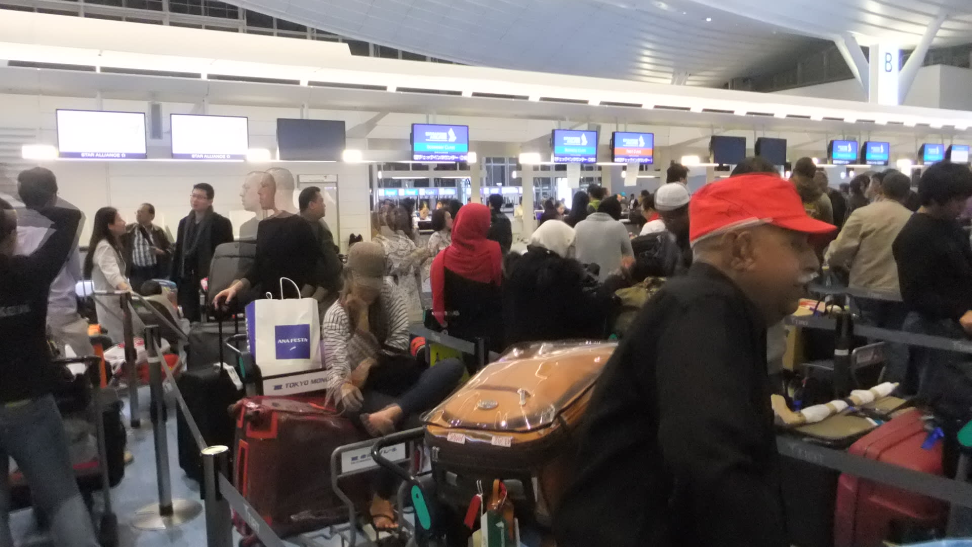 深夜の羽田、現在10時過ぎ人が多い。昨日地震でフライト欠航と