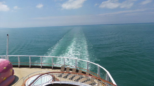 でかい船、息を飲む。飛鳥五万トンも圧倒だが、これが7万トン。派手なフアンネル。そして隣に
