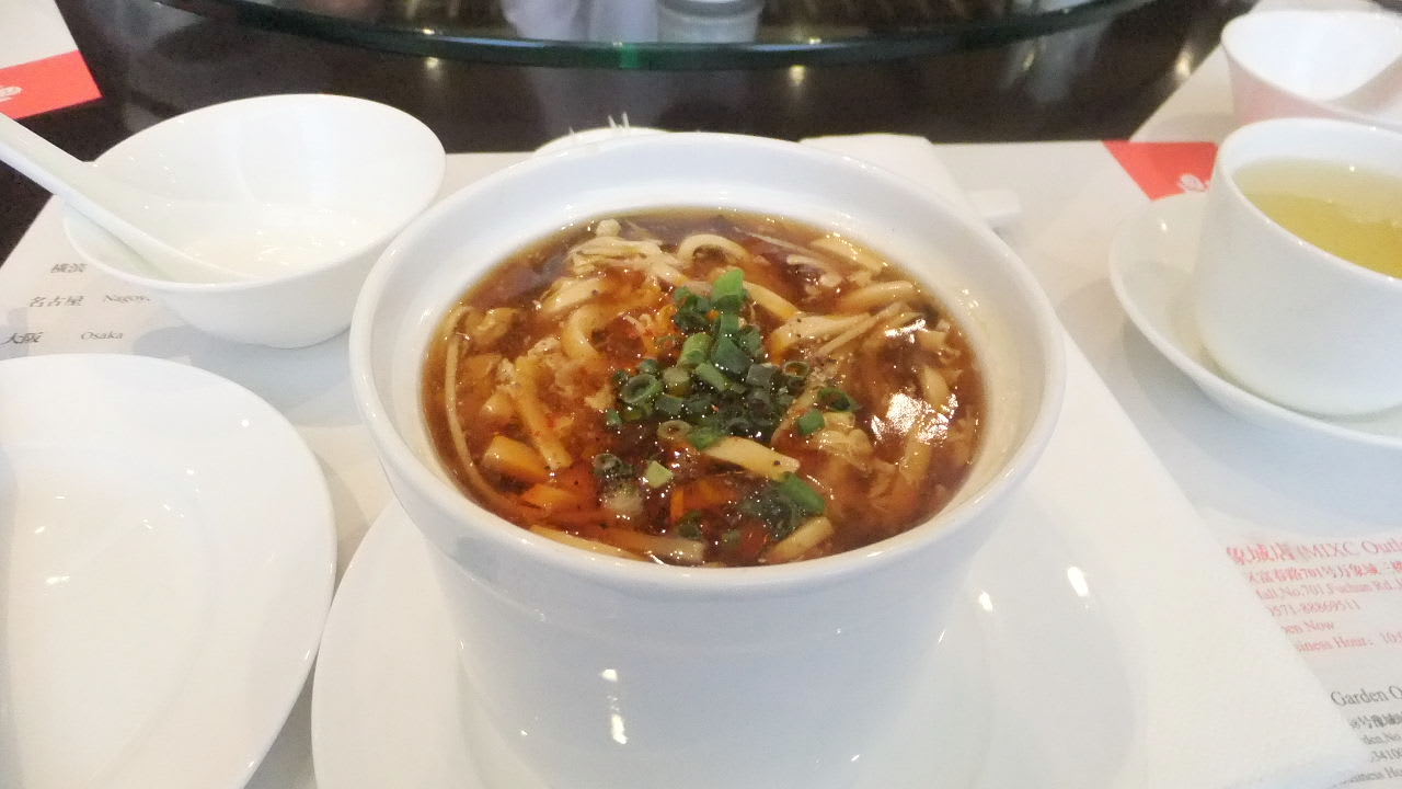 先ずは辛い酸辣湯スープ、麺状の点心が入ったスープ。