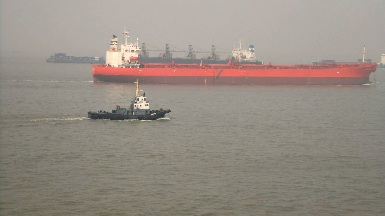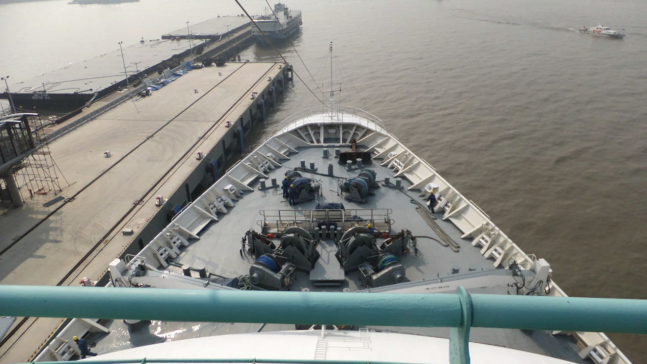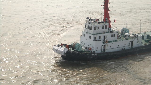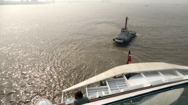 国際ターミナルのある黄浦江の川幅の狭い川なら、タグもわかるが、対岸が見えない幅ひろい長江で何故タグ曳航の回転なのかよくわからない。