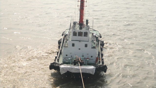その後、後ろのタグボートとロープで結ばれ、タグボートが船尾を引っ張る