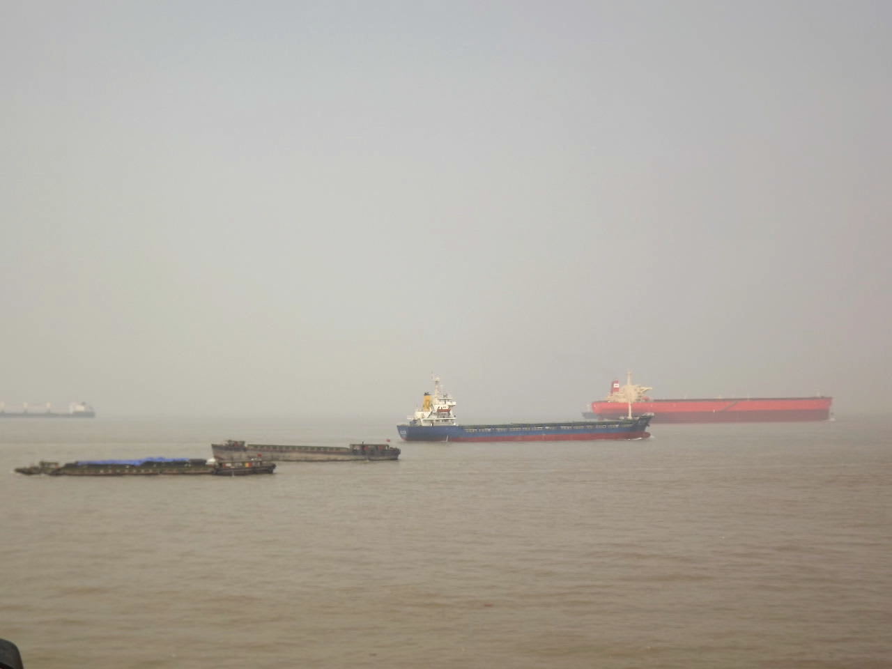 長江は茶色の川、多くの船舶が中国内陸へと行き来する。ようやく出航した。