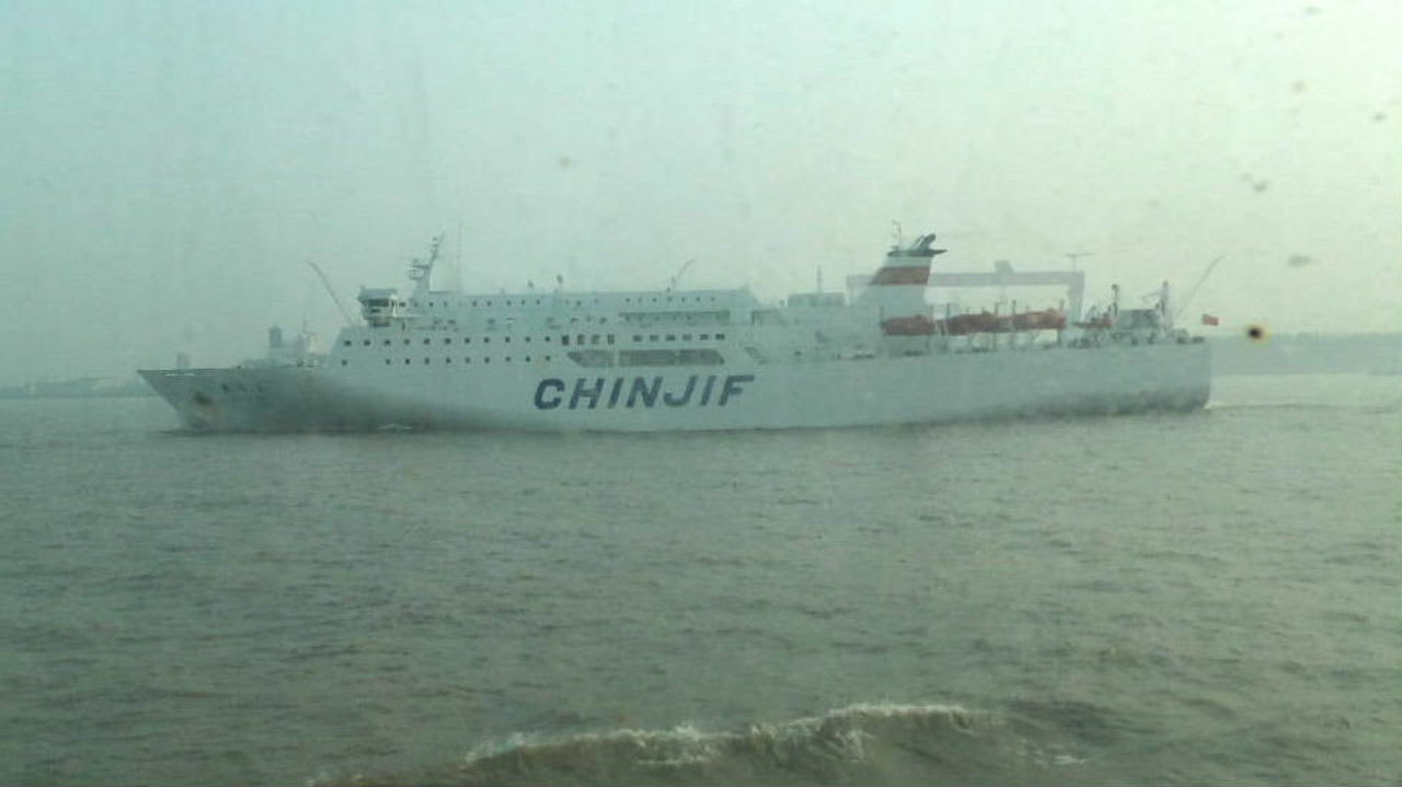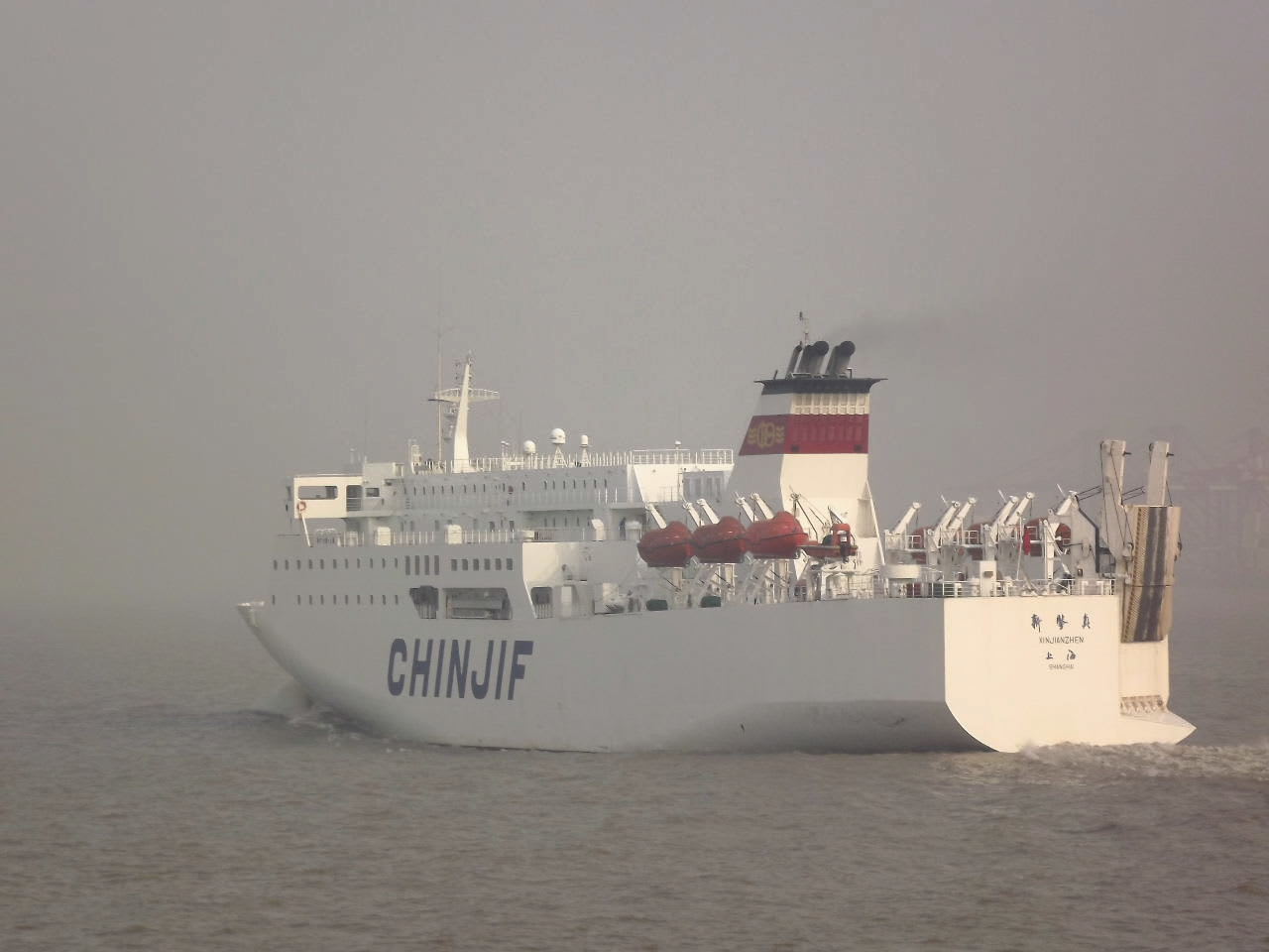 上海の中心部を流れる黄浦江川との交流点を過ぎた頃、キャビンに戻ると、船の後より白く早い船が追いかけてくる。国際ターミナル停泊していた上海⇔神戸 定期フェリー「新鍳真」号だ。