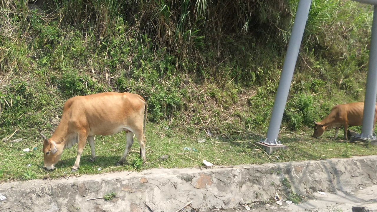 しばらく走ると、なんと野生の牛がいる、バイクを止めてもらった。
