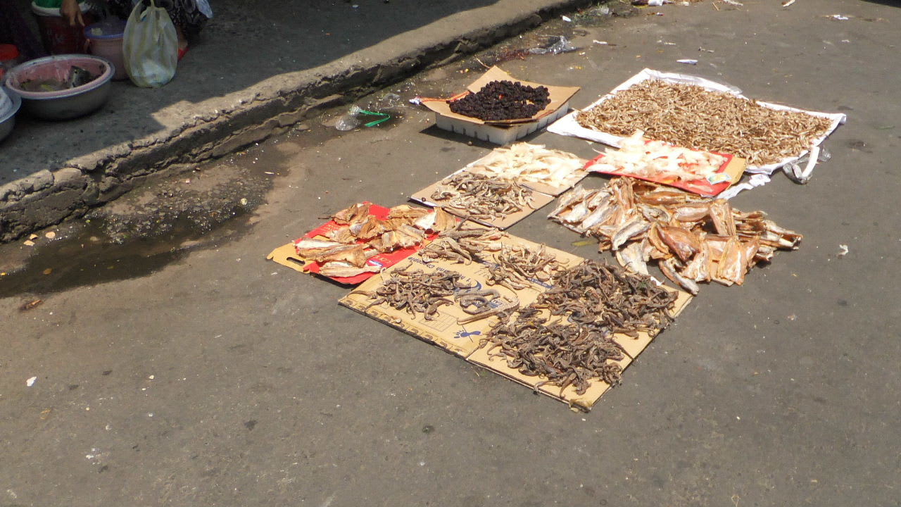 道路に並べたこの商品はドライフルーツと干し魚と思われる。