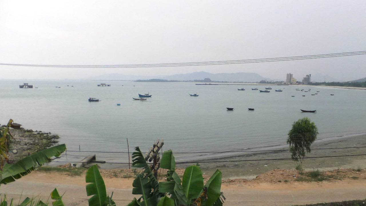 美しい海岸が続く、その湾の中にベトナムの漁船が多数停泊している。