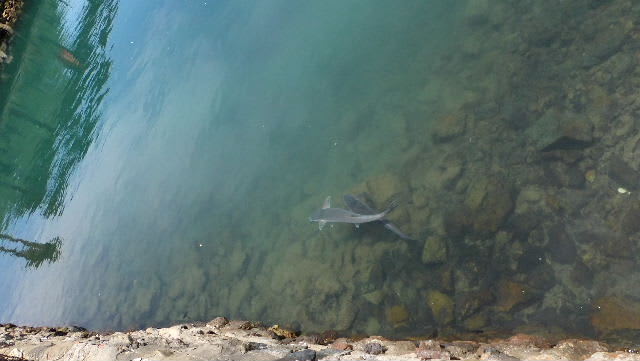 更に進むと海水の池があり、サメの様な魚が泳いでいて、奥に建物がある。