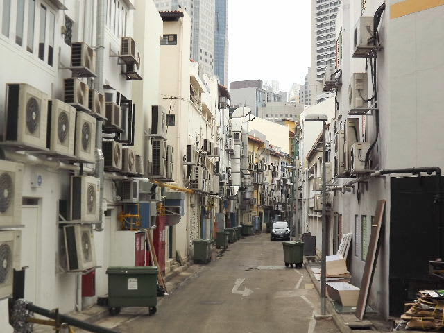 上の画像は、シンガポールの裏通り、クーラーのオンパレードである。