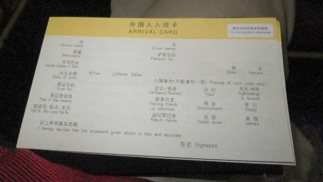 中国入国カードが配られる、なにか予感がありここで