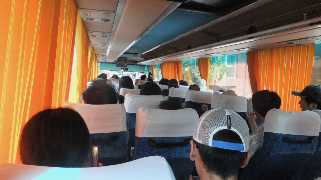 ようやく、受付チェックインが終了すると、長い廊下を歩くと、なんとさっき下った車道に出る、そこにミニバスが停まっていた乗車する。ぎゅうぎゅう積めだ。