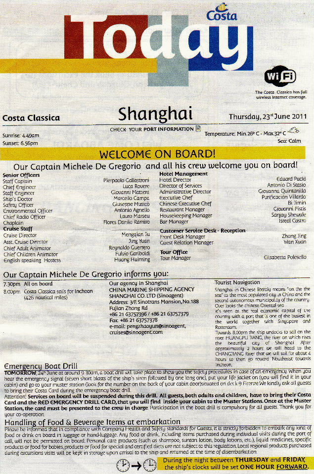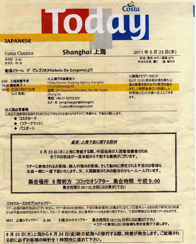 愉快なCosta Classica アジア2ヶ国航海 中国・韓国の旅8 船内新聞「Today」