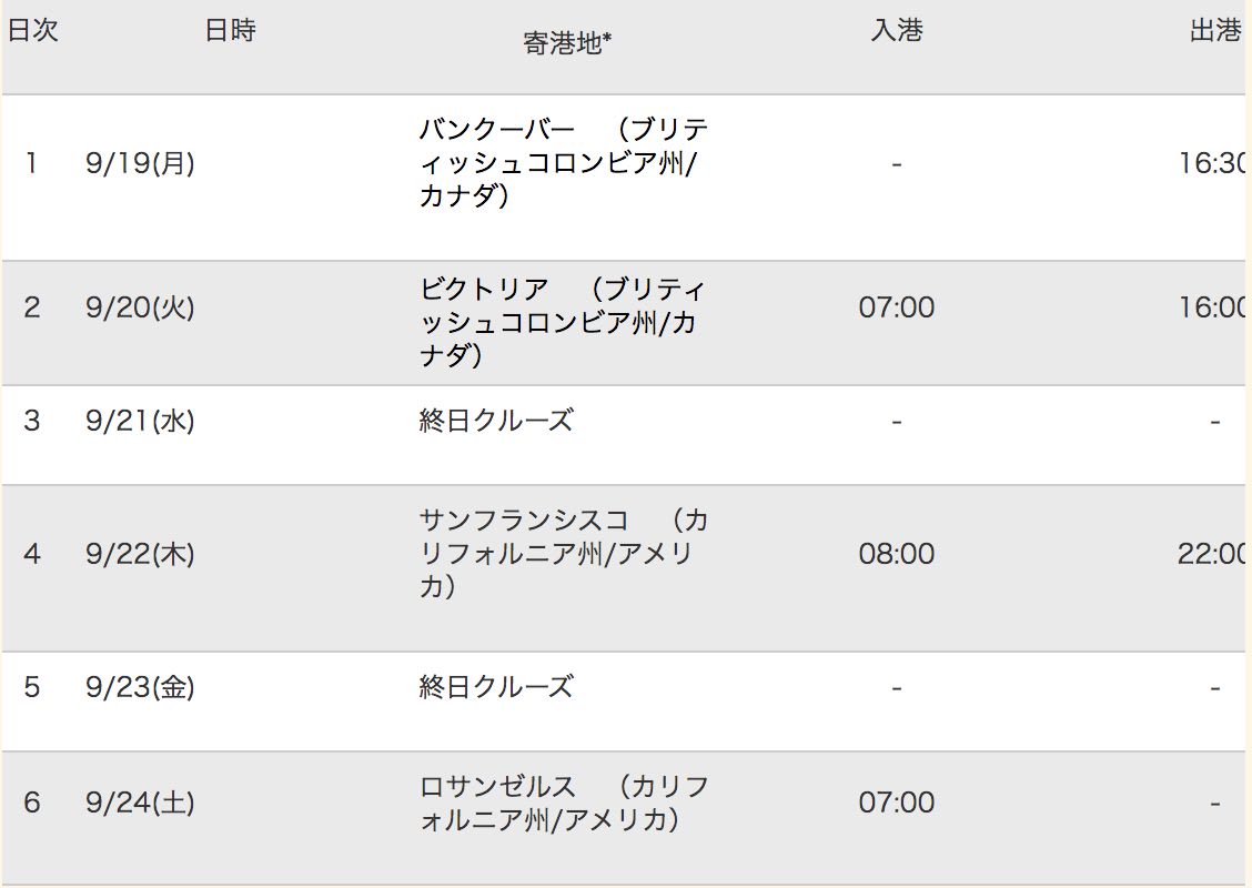 9月19日〜24日のカナダ・アメリカの2ヶ国のクルーズだ。