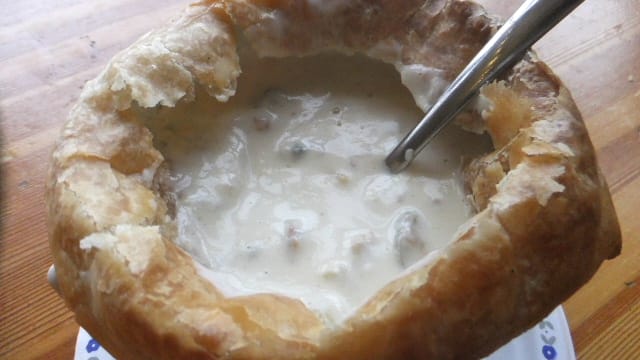 ロシアのつぼ焼きと同じ、パイで蓋をした壷の中は、魚介のクリームスープ海老、貝など多数の魚介があり、結構な量でした。