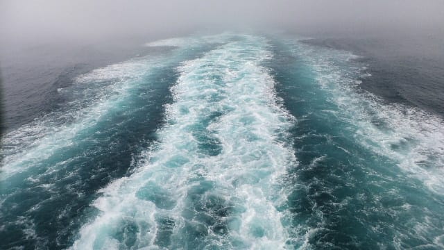 ![](embed:photo/79195) なんか1時間前から、雨止み、波も静か、 明日到着予定が、もう伊豆の大島沖縄か?、 あと四時間くらいで横浜大桟橋。 台湾から 22ノット高速航行。もう大桟橋は近い。 大画面液晶ビジョンの前にも人はいな