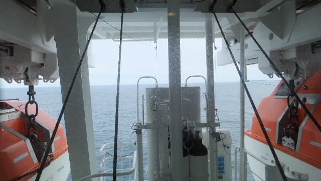 船の船首に近いE-306キャビンにて、丁度テンダーボート二隻の間。