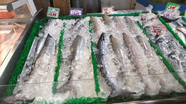 こちらの鮭は頭がついている。鮭大きいの一匹四ドルほど。安い。