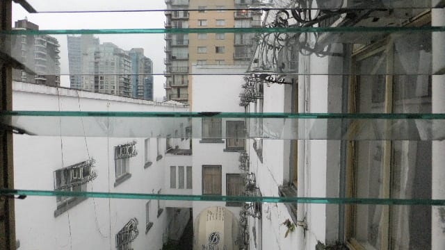 バンクーバーは海の街、窓にするどく出る針金は鳥よけ。