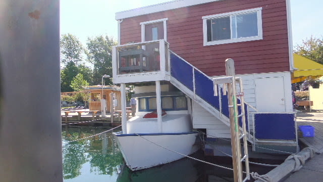 さて、景色を見てビックリ、桟橋の船の上に家を建てている。