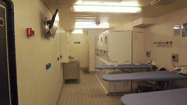 さあ洗濯、船首にある私のキャビンから、長い長い松の廊下を船尾に向う。