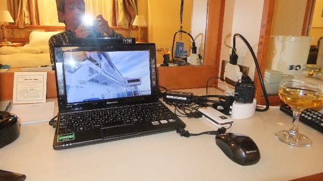 ![](embed:photo/79195) なんか1時間前から、雨止み、波も静か、 明日到着予定が、もう伊豆の大島沖縄か?、 あと四時間くらいで横浜大桟橋。 台湾から 22ノット高速航行。もう大桟橋は近い。 大画面液晶ビジョンの前にも人はいな