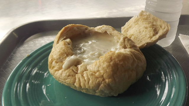 くり抜きパンの中に、ラムチャウダースープが入る。最後はパンを食べる。