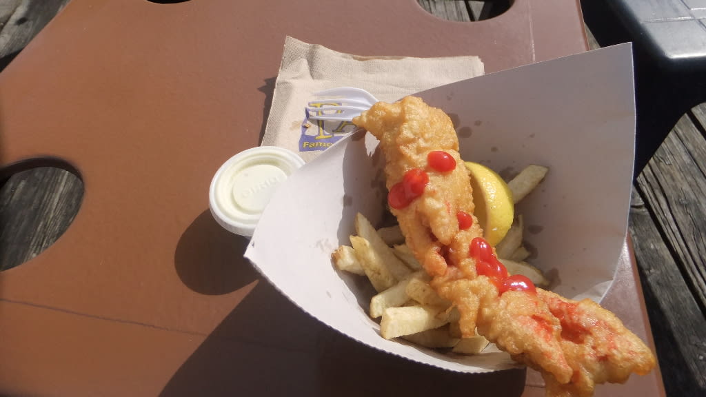 番号札をもらい揚げたてを頂く。これはサーモンのフイッシュアンド チップス。