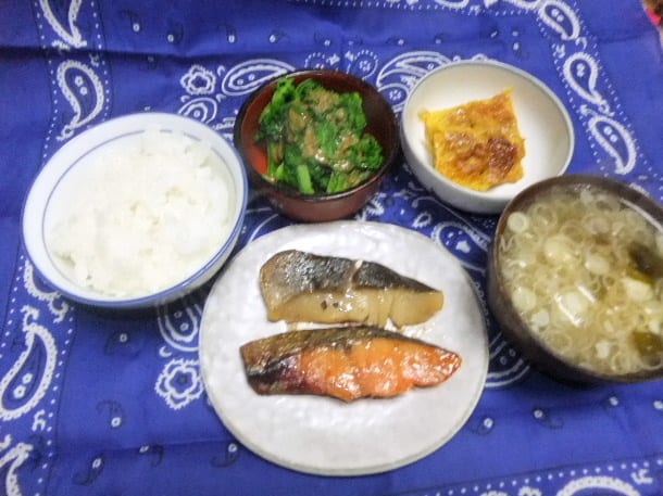 全体はこんな感じ、ご飯・味噌汁・粕漬け二切れ・菜の花のからしあえ・玉子焼き