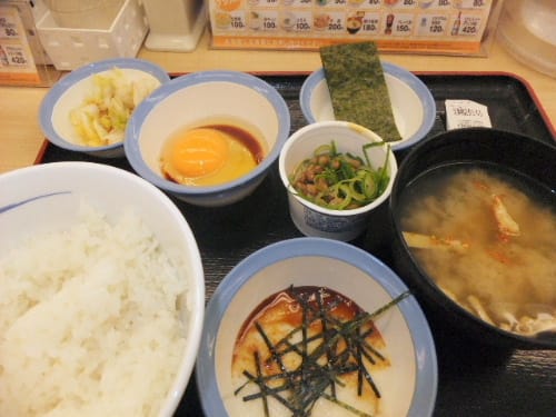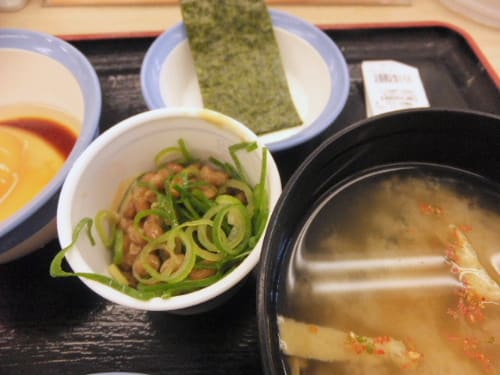内容は銀シャリご飯、味噌汁、お新香、ヤマイモ、そして生たまご、海苔さらに追加の納豆だ。