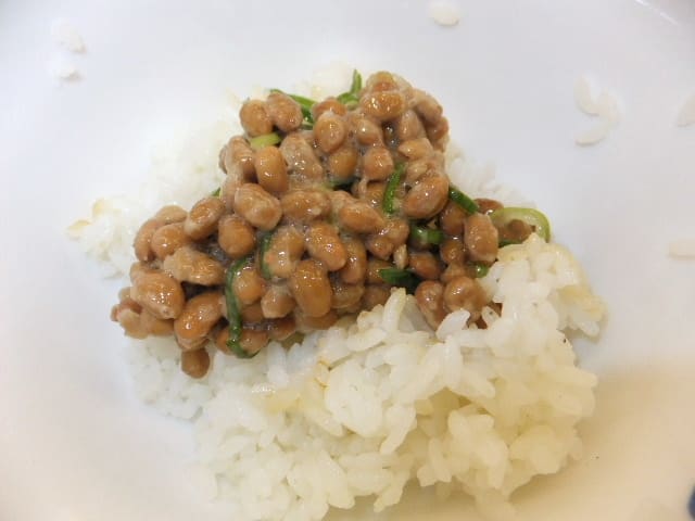味噌汁にはたっぷりの七味。納豆はカラシを全部いれ、よくかき混ぜる。