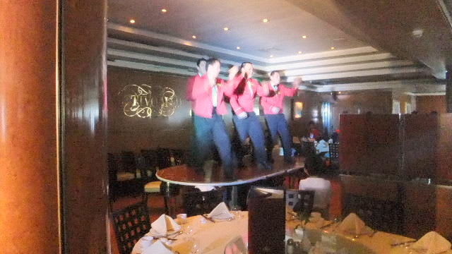 ウエイターがテーブルの上で踊り歌う