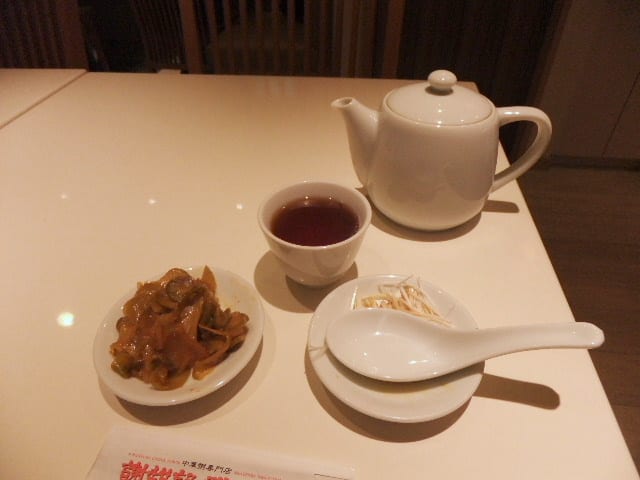 早速、熱いお茶と、ザーサイ・粥の薬味が運ばれる。