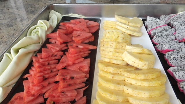スイカ、パイン、ドラゴンフルーツ。日によりフルーツは変わる。