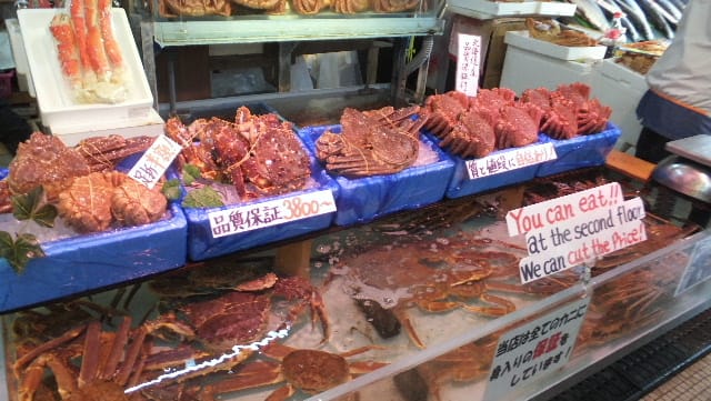 朝市、蟹を販売している、「ああやはり蟹は高い。」