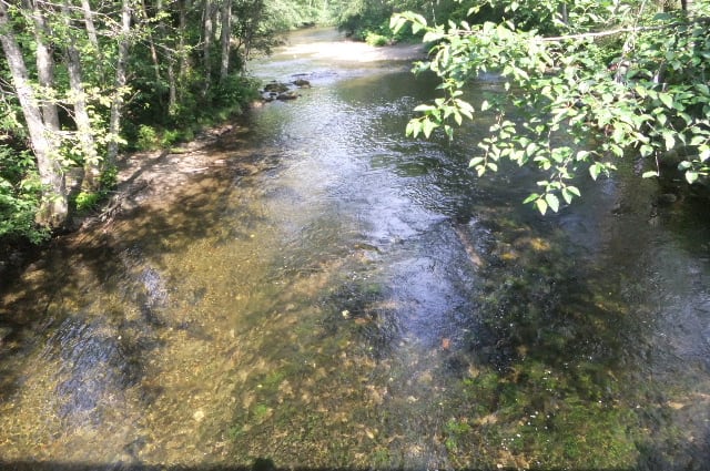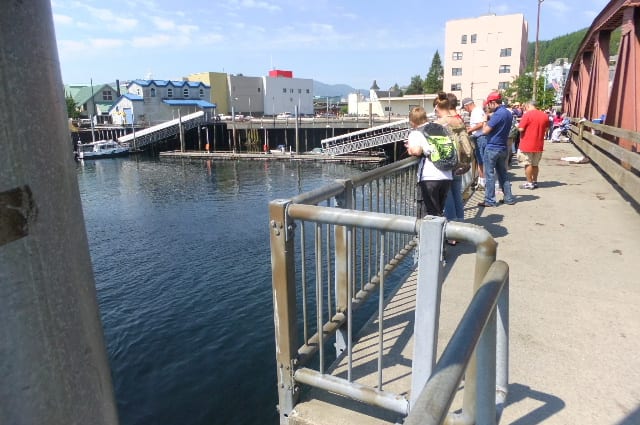 下を見ると、鮭の群れが見える。ここで釣りをする。