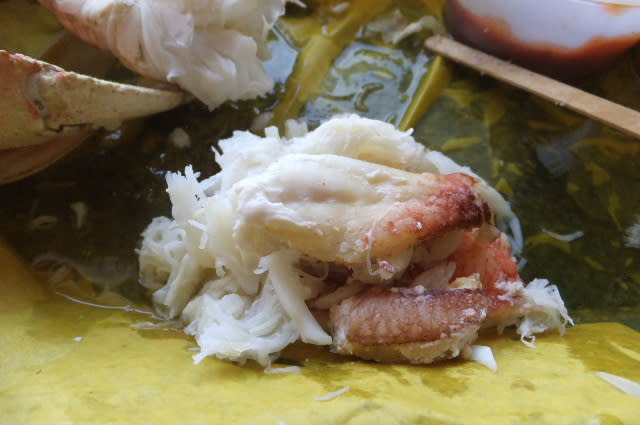 しかし蟹を食べるのは大変、ジュノーに引き続き「蟹」、ソースはまた「オイル」と「チリソース」。なにもつけないのが美味しいかもしれない。