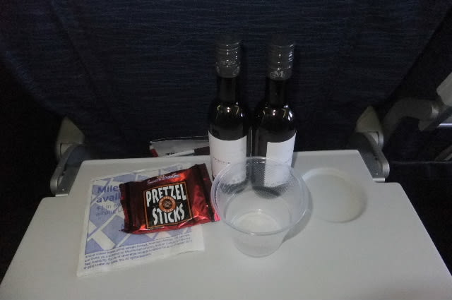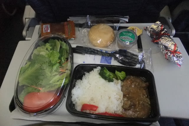 日本人クルーは、ビジネス専用、行きのフライトと同じクルーのアメリカおばちゃんのCAだった。