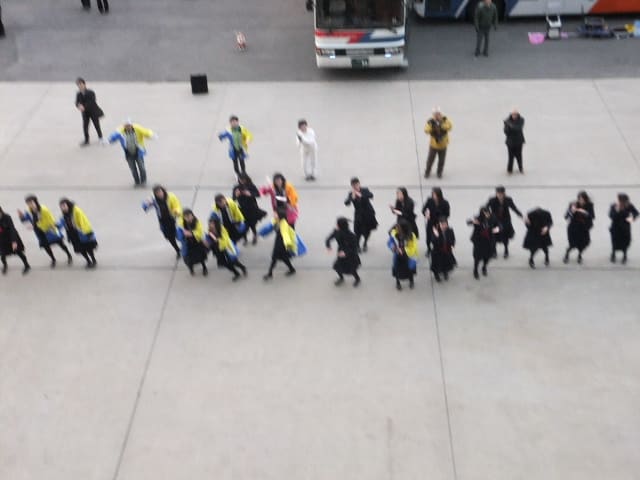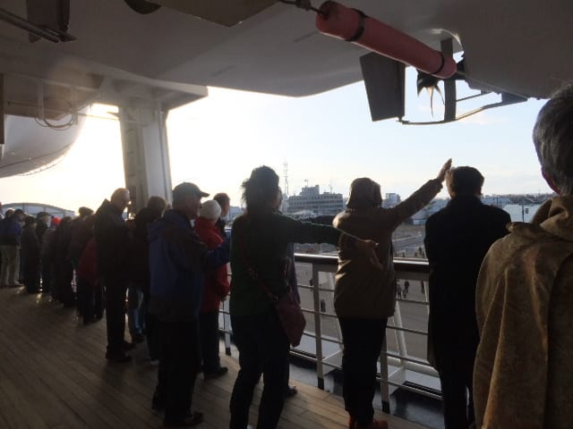 そう、この函館案内役の女子高生の、お見送り隊に、全ての外国人客が、感謝しているのた゛、そして出港前に「イカ踊り」が始まった。