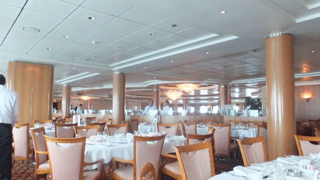 私も最初は朝、昼、バッフェへ行きましたが途中からダイニングルームにしました。 落ち着いて良いです。 下船説明会はたいていの船でこのようにクルーが総出します。 だから、最後のほうに行くと良いところだけ見られます。