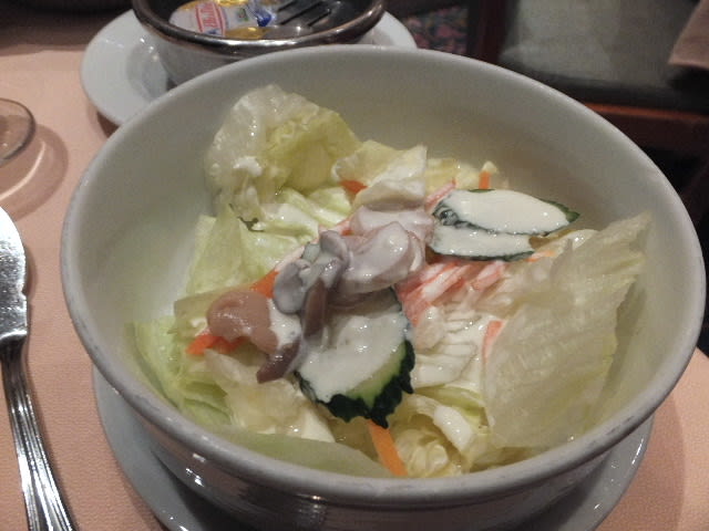 次はサラダ。うーんこれはたいした事ない。多彩だが人参の細切りが、「牛丼」松屋のサラダを彷彿。ドレッシングはイタリアンもあるが、フレンチとする。