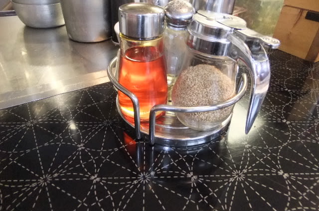 薬味は、胡椒にラー油もあるぞ。白胡麻もある、たっぷりかけよう。
