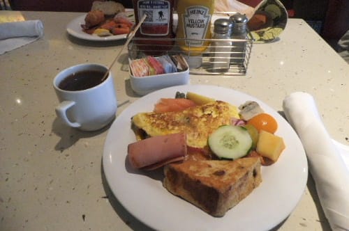 この船のオムレツ大きすぎる、すごく腹にたまる。あとはフレンチトーストやベーコンなど、フルーツもまあまあ豊富。