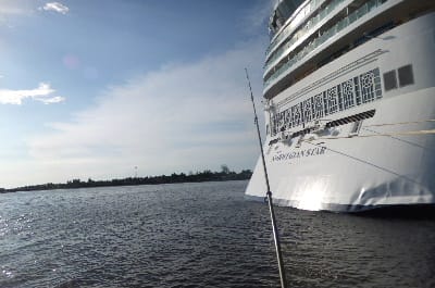 シャトルバスで港に戻り、船のaftにて、釣竿を出す。