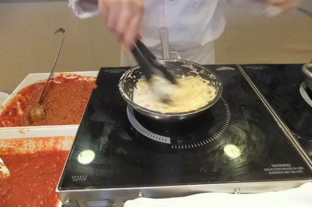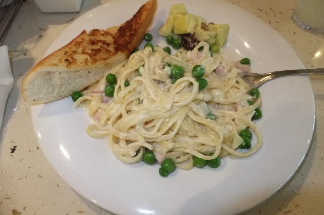 ランチは、今日もパスタ、ノーマルにホワイトソース、ハムとチーズ、オニオン。