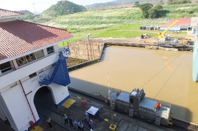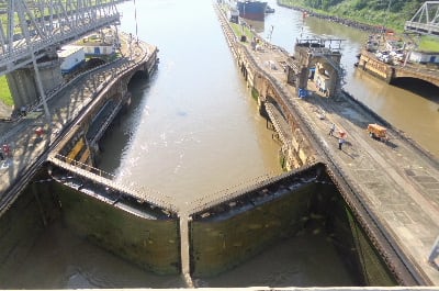 船は、陸のGatun Lake湖まで、約26meter、水門により高度を上げないといけない。