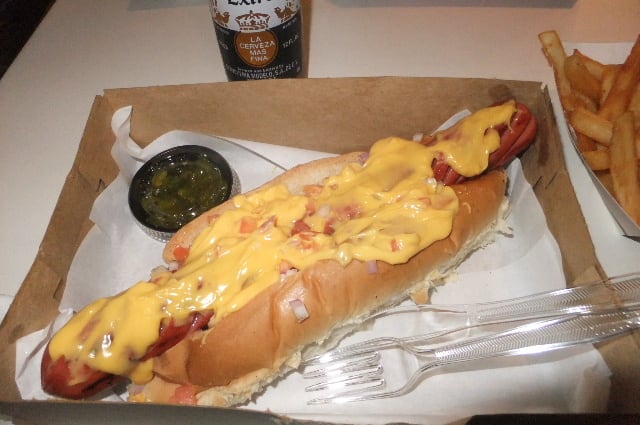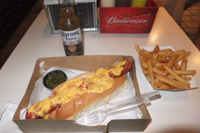 よくぞこんな、大きなホットドック作った、ようやく食べきる、フレンチフライは全て