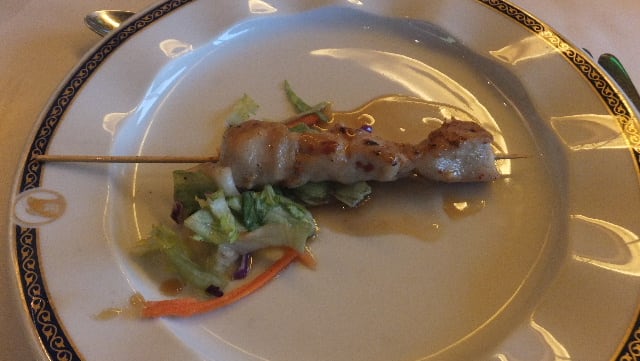 ●前菜 焼鳥 「なにこれ?」 確かに焼鳥らしく思える、ソース違うぞ、七味何処?