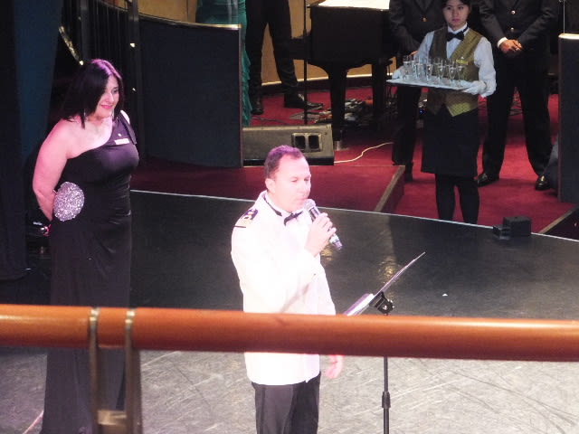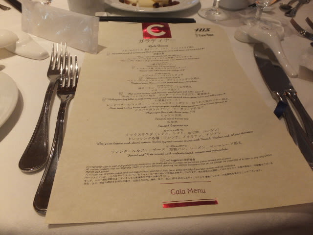 先ずは、船長主催カクテルパーティー。後の席にすわり、シャンパン飲み放題。
