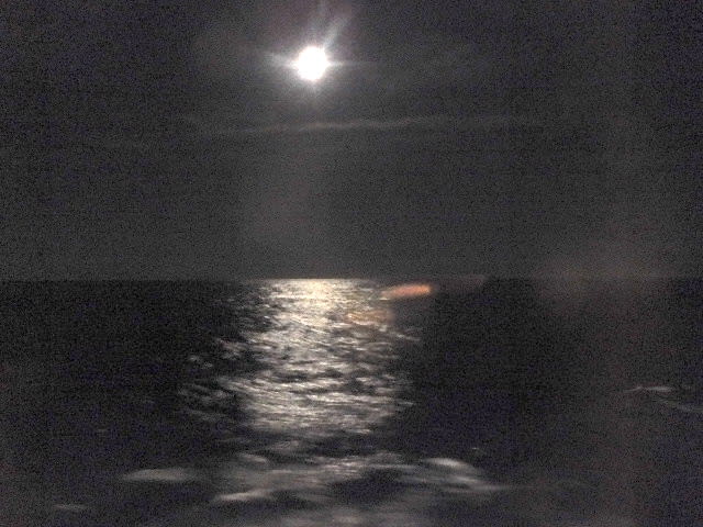 写真が下手で、うまく撮影できないが、満月の月光が、遠く海を照らす。