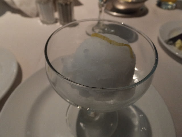 前菜、サラダ、パスタ、口直しのラム酒のシャーベット